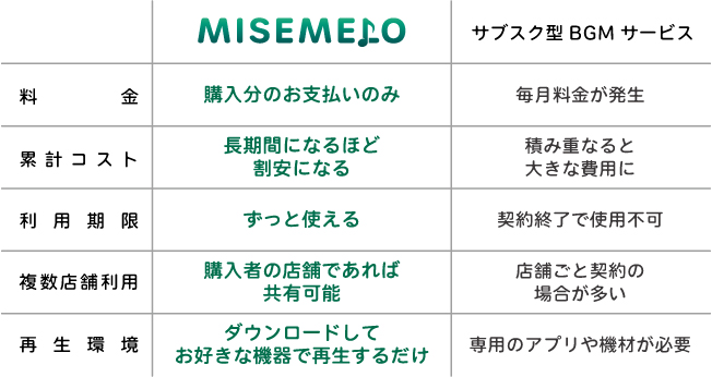 MISEMELOのBGMは、一度購入していただくだけで、追加費用は一切かかりません。
